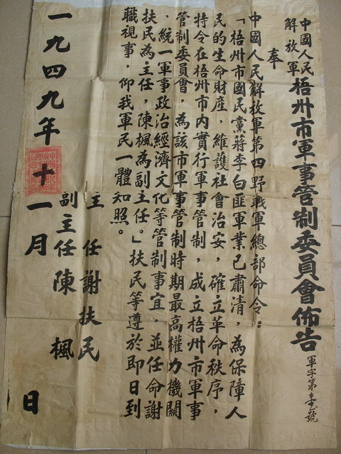 ?1950年12月1日,中國人民解放軍第四野戰(zhàn)軍總部發(fā)出軍字第一號布告,宣布梧州市軍事管制委員會正式成立,并在梧州市內實行軍事管制,謝扶民任軍管會主任,陳楓任副主任。后因謝扶民因事未到職,由張華任軍管會代主任。同年底,廣西軍區(qū)司令部加派154師政委曹傳贊為市軍管會第一副主任。