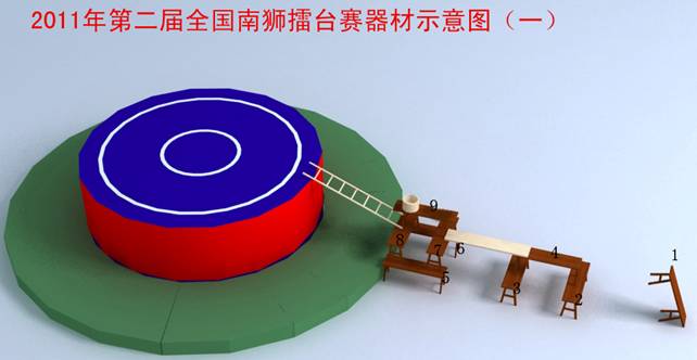 ????1、擂臺(tái)為圓形,規(guī)格:高度為1.5米,直徑7米。(擂臺(tái)中間標(biāo)有直徑2米的圓形分隔區(qū),擂臺(tái)邊緣設(shè)立距離臺(tái)邊0.5米的圓形下臺(tái)警戒線)比賽開始前,雙方舞獅運(yùn)動(dòng)員不得進(jìn)入分隔區(qū)。