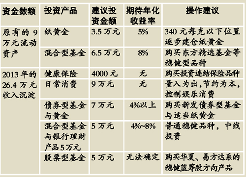 ????1.9萬元流動資產數額有限,不建議做繁多投資。適逢金價低位,建議購買3.5萬元的紙黃金。剩余的6.5萬元資金建議購買風格穩健的混合型基金。
