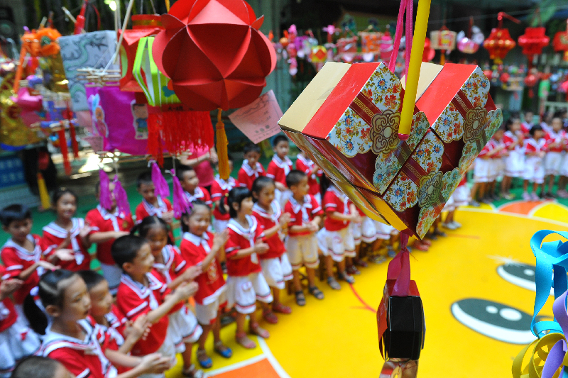 用筷子做的宮廷花燈、用電線繞的挖掘機花燈、由油桶“變”的企鵝花燈……9月18日,梧州市第二幼兒園的操場被百數盞花燈點綴著,該幼兒園的“大手牽小手,中秋樂融融”慶中秋系列活動在濃郁的中秋氛圍下舉行。如果說各式各樣的花燈為孩子們帶來歡樂,那活動中的神話故事表演、現場月餅制作等環節,則讓孩子們提前度過了一個頗具中國傳統特色的中秋佳節。