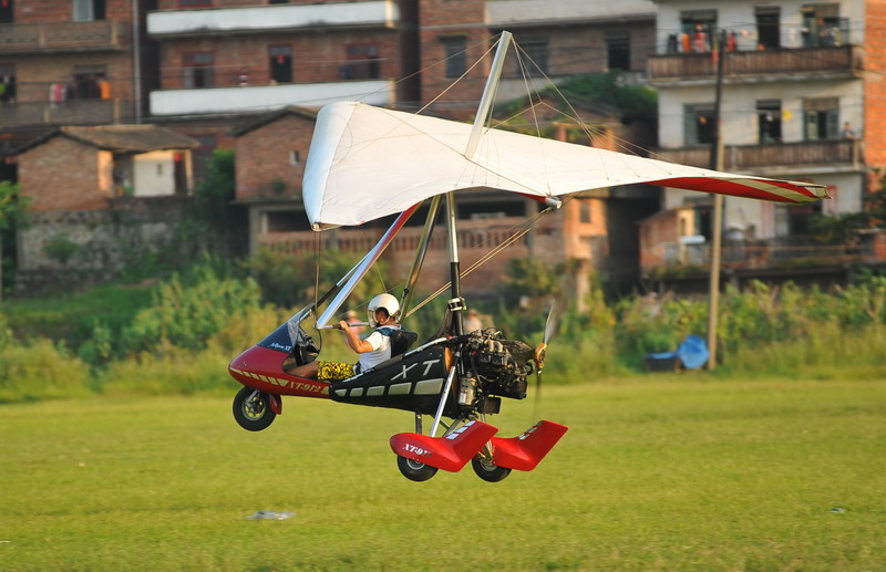 愛好者駕駛動力三角翼在草坪上起飛。何鎏/攝