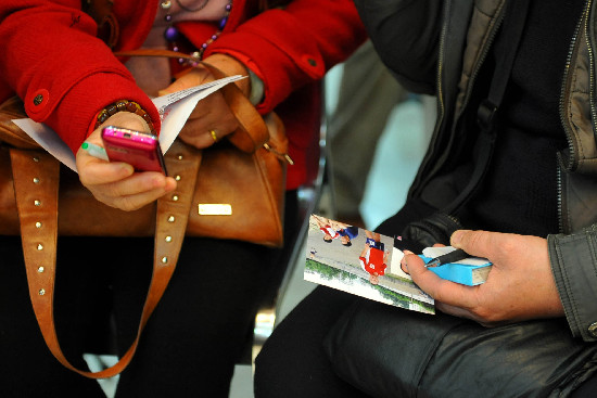 兩位家長在相互展示孩子的照片,很多家長都是有備而來,不忘記拿上孩子的全套資料。