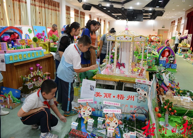 ??? 10月20日下午,學(xué)生和家長在振興小學(xué)參觀“魅力梧州·幸福家園”手工作品創(chuàng)意大賽作品。