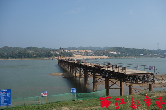 用于臨時施工的鋼棧橋已從岸邊延伸到江中。