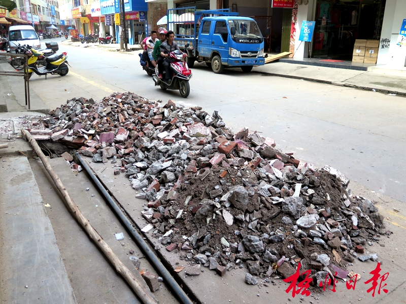 在旺甫鎮鎮區,堆放的建筑垃圾占去了路面約三分之一的位置,影響了環境衛生和車輛行人通行(攝于5月12日)。李欣鞠 攝