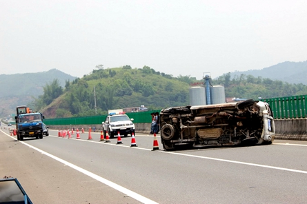 轎車在高速路上爆胎側翻 多名乘客受輕傷