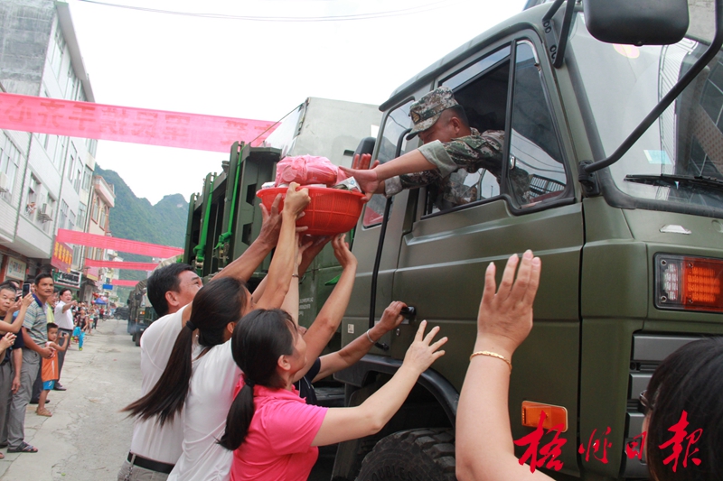 ?6月23日,在河池市大化縣,梧州陸軍預備役工兵團官兵婉拒當地群眾送來的食品和飲料。 當天19時30分許,梧州陸軍預備役工兵團官兵圓滿完成馳援河池大化搶險救災任務,安全返回團部。在此次馳援河池大化搶險救災中,該團出動的門橋裝備發揮了重要作用,使推土機、挖掘機等大重型裝備順利投入搶險救災,為防止死豬引發疫情贏得寶貴時間。大化縣縣委、政府向該團贈送一面錦旗表達感激之情,當地群眾也在該團官兵返回途中夾道相送。 李銘 陳小泉 攝