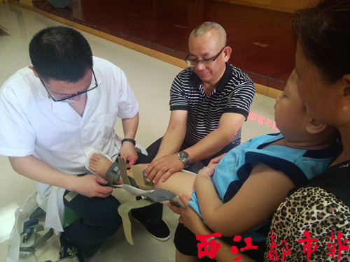 工作現場,技術人員逐一向受助兒童及其家長詢問并了解兒童目前的康復進展,在對需要裝配矯形器的肢體關節部位進行了細致的觀察與按摩后,才為兒童穿戴上矯形器,并細心地加以調節。