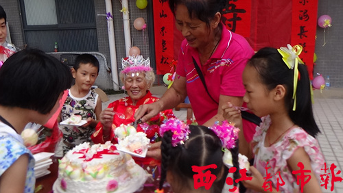 當天,前來參加楊鳳帶老奶奶生日派對的居民有老有少,一共三十多人。一位八十多歲的老爺爺,為楊鳳帶老奶奶表演了太極拳;而熱愛舞蹈的居民,則為老奶奶跳舞助興;還有稚氣未脫的孩子,和老奶奶一起吹蠟燭、分蛋糕,其樂融融。