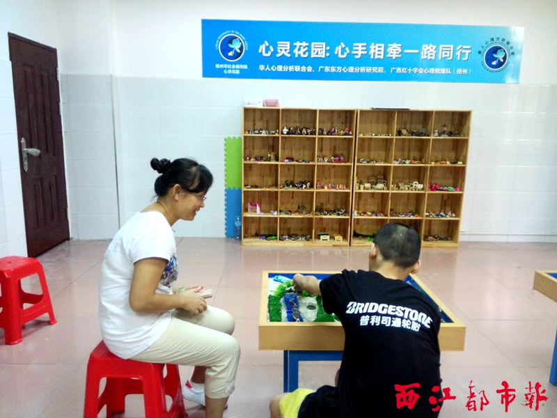 ????為幫助這些孩子解開心靈枷鎖,今年6月,由梧州市福利院和梧州市紅十字會心理救援隊共同建立的心靈花園梧州工作站投入使用。26名擁有心理咨詢師資格證或經(jīng)過專業(yè)培訓的志愿者,采用團體輔導和一對一交流的形式,結(jié)合沙盤游戲等方法,對福利院內(nèi)的特殊兒童開展心理輔導。