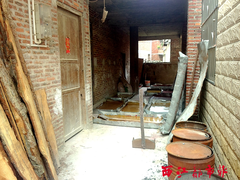 ????7月20日上午,記者到竹灣村五組5號(hào)走訪,發(fā)現(xiàn)網(wǎng)友所指的居民樓從外表上看,是一棟普通磚混結(jié)構(gòu)的住房,其周圍是較為密集的住宅區(qū)。記者走近觀察,發(fā)現(xiàn)房子里堆放著許多粉紅色的化學(xué)藥劑,院子里堆放著十幾個(gè)鐵桶,看上去很像一家小型加工廠。而房屋的住戶對(duì)于記者的來訪顯得很警惕,不停詢問記者的身份和此行目的。