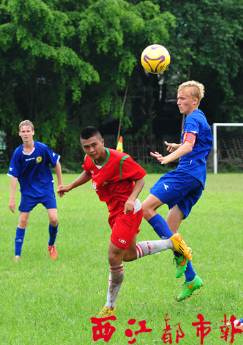 在U17年齡組的決賽中,雙方隊員在積極爭搶頭球。7月25日,2015年兩岸十地青少年足球邀請賽在梧州國家體訓基地圓滿落幕。經過一個星期的激烈比拼,賽事決出了八個年齡段共十一個組別的冠軍。據悉,今年的兩岸十地青少年足球邀請賽,創下了全國青少年同類足球夏令營有史以來規模最大、參加人數最多、涉及面最廣的紀錄,同時,俄羅斯、馬來西亞、越南等國外球隊的加入,更為賽事增添了不少亮點。記者 陳健新 攝