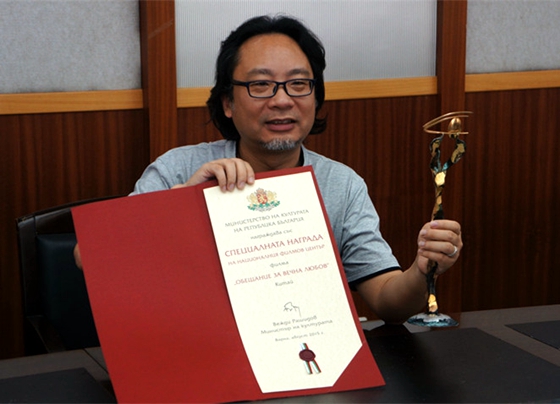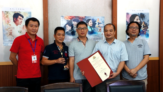 廣東廣視傳媒有限公司導演、電影《天各一方》導演云山向媒體朋友展示早前在2015年保加利亞第23屆瓦爾納國際電影節上榮獲的最佳影片獎的獎狀和獎杯