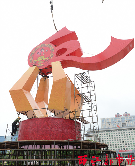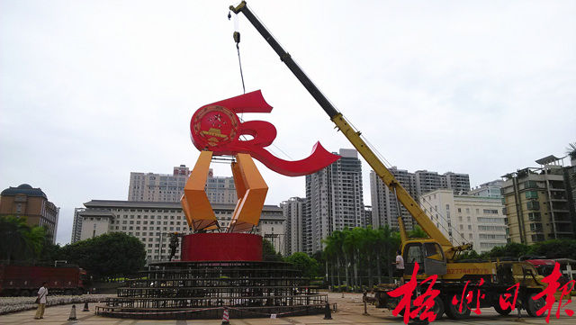 ????9月21日,在市政廣場,施工人員正在吊裝國慶節(jié)主題造型景觀。