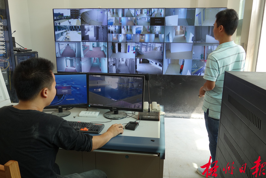 ????10月22日,在梧州市游泳(跳水)館控制室,工作人員通過智能化監控系統查看場館內外環境。
