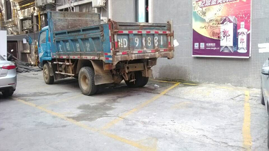 10月20日,記者來到位于迎賓路的儒膳房酒樓實地走訪,發現該酒樓門前確實停放有一輛車牌號為桂D91881的大卡車,車子的擋風玻璃和車內方向盤、坐椅等都較為陳舊,車前并沒有張貼2015年的年檢標志。該卡車并沒有按照地上的黃色停車線停放,而是橫停在三個停車位上,所以泥頭車前方空著的一個停車位也無法使用。其中一輛私家車只能與卡車平行停放在停車線外。