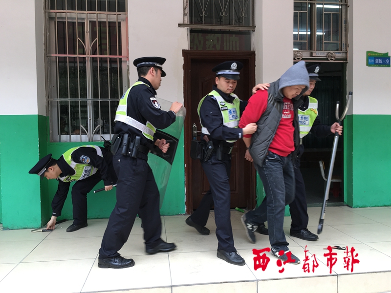 演練中,特警將“歹徒”制服并帶離現場。西江都市報記者 李玉瑩/攝