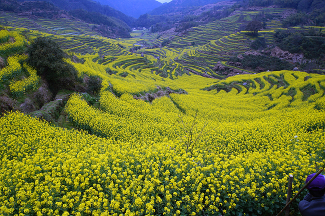 ????在觀景臺遠望,那是一幅夢境般的圖畫——群山環峙的村莊被綠黃色團團包裹,金黃色的花、白色的村落、青綠的山勾勒出一幅世外桃源美景。剛剛盛開的梯田花海,從山頂至山腳,從此山到彼山,沿著山坡層層疊疊,漫山遍野,蔚為壯觀。