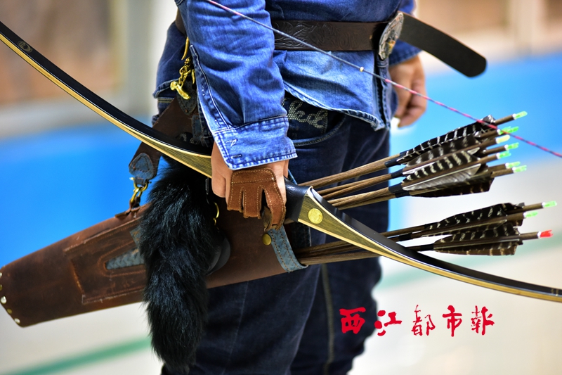 木弓、手工皮箭壺、真羽木箭、皮手套……這一套行頭穿在身上,頗有點cosplay的味道。