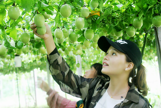 游客在挑選成熟的百香果采摘。 吳家寧/攝