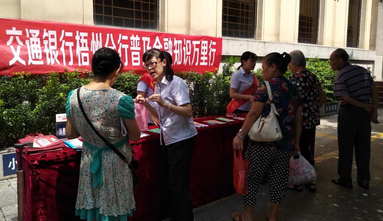 活動現場 這是交行梧州分行為全面落實第五次全國金融工作會議關于“加快建立完善有利于金融消費者權益的機制”要求,積極開展金融消費者權益保護宣傳及消費者教育服務,努力提升銀行消費者金融素質和安全意識,在梧州銀協的統一部署下,開展的又一次群眾金融消保服務宣傳活動。