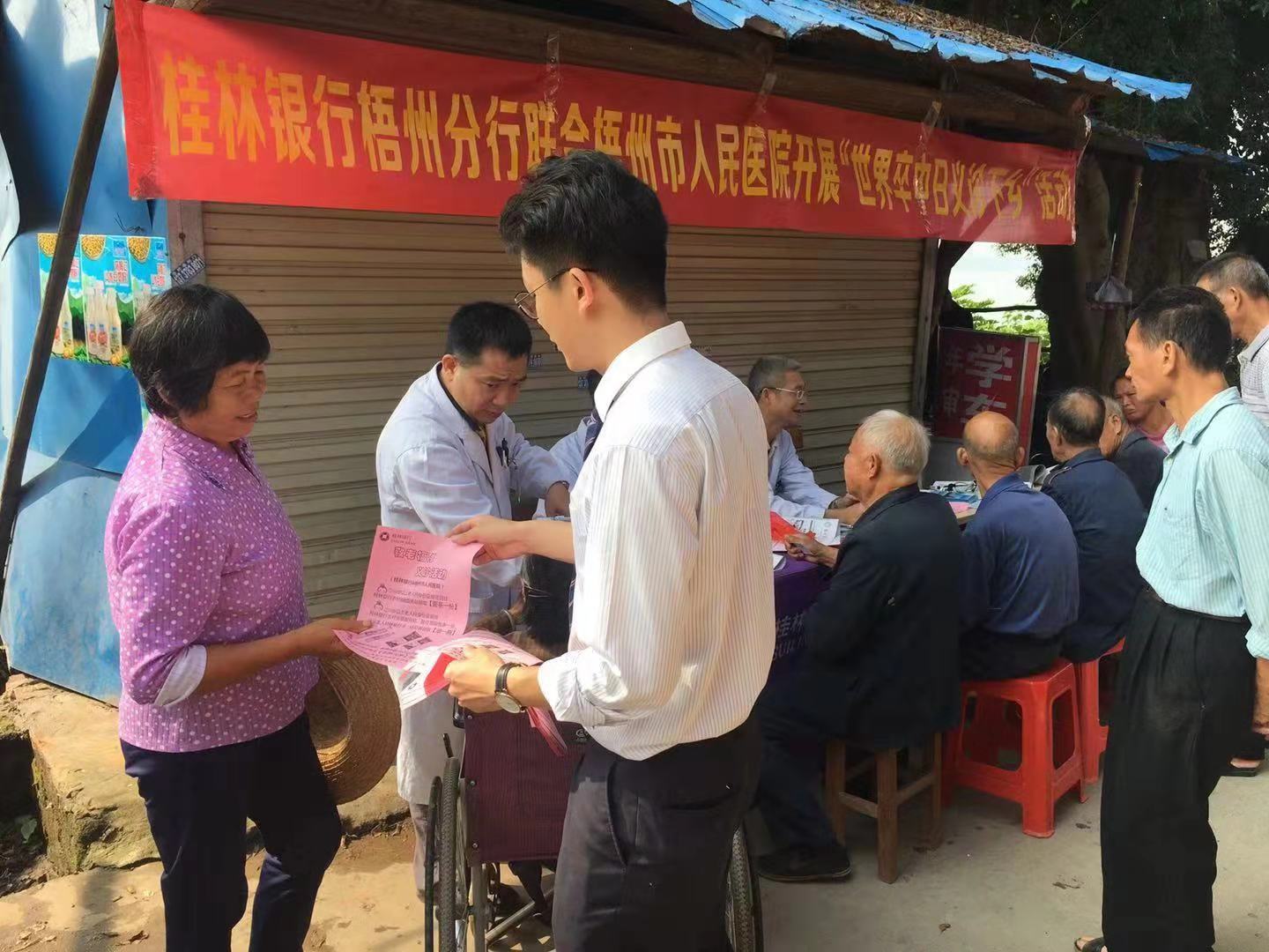 為持續推進健康扶貧人人受益,讓農村老百姓能享受到實實在在的健康服務,桂林銀行梧州新興支行于10月25日邀請梧州市人民醫院專家教授一行8人前往該行對接的長洲鎮寺沖村,開展下鄉敬老福利-“世界卒中日健康義診”活動。 該行于近期在寺沖村設立了農村金融服務站,在開展金融活動中了解到寺沖村常住人口中老年人居多、因病在村休養人員就診不便、群眾對常見病、慢性病重視不夠等實際問題,特邀市人民醫院醫療隊為全村群眾開展扶貧義診,為保障群眾健康提供健康支持。