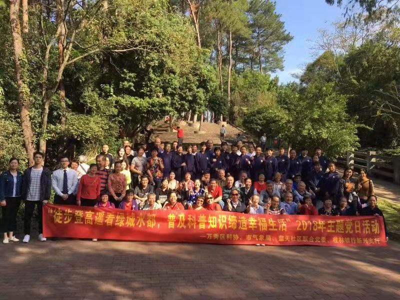 11月2日,為倡導(dǎo)科學(xué)文明,健康和諧的生活方式,提高全民科學(xué)文化知識(shí),梧州新興支行聯(lián)合藍(lán)天社區(qū)黨委開展2018年“徒步登高遙看綠城水都,普及科普知識(shí)締造幸福生活”主題黨日活動(dòng)。來(lái)自社區(qū)的60多位黨員代表和居民群眾相聚在傍山公園參與主題活動(dòng)。 本次活動(dòng)邀請(qǐng)了梧州市太極隊(duì),每個(gè)隊(duì)友都精神抖擻,神采奕奕,向黨員群眾展示了太極拳和太極劍,宣傳普及太極文化。隨后,支行員工還舉辦了金融知識(shí)小講堂、金融知識(shí)有獎(jiǎng)問答、參觀氣象臺(tái)環(huán)節(jié),現(xiàn)場(chǎng)人員踴躍參與、掌聲絡(luò)繹不絕,獲得了黨員和居民群眾的一致好評(píng)。