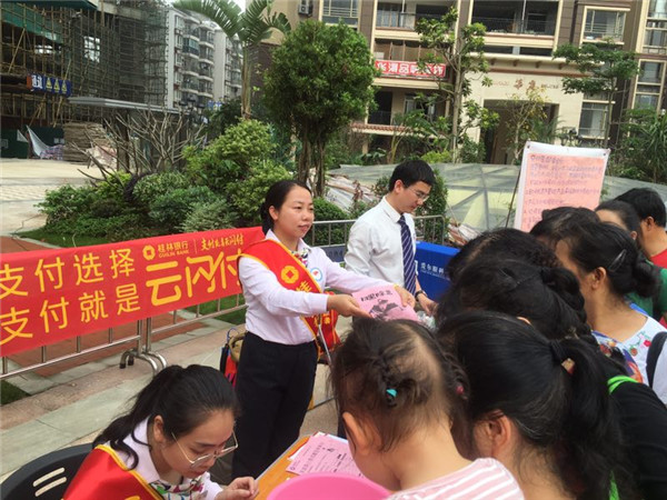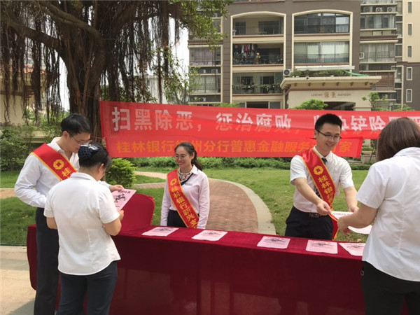 在長洲區法院法官為居民普及司法知識,以增強居民法治觀念,共建和諧社會之后,桂林銀行新興支行的黨員和青年團員代表以“掃黑除惡”為主題開展宣傳活動,向居民分發關于“掃黑除惡”的宣傳折頁,介紹“掃黑除惡”的工作措施、舉報途徑等。活動中,桂林銀行新興支行的黨員和青年團員代表還結合游園游戲、金融知識有獎問答等互動環節,宣傳反假貨幣知識,提升居民對非法金融活動的警惕。活動現場熱鬧非凡,居民積極參與問答和游戲活動,宣傳效果顯著。