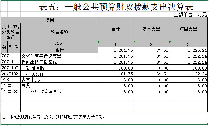 第四部分:專業名詞解釋 (一)財政撥款收入:指本級財政部門當年撥付的資金。 (二)事業收入:指事業單位開展專業業務活動及輔助活動所取得的收入。 (三)經營收入:指事業單位在專業業務活動及其輔助活動之外開展非獨立核算經營活動取得的收入。 (四)其他收入:指除上述“財政撥款收入”“事業收入”“經營收入”等以外的收入。 (五)用事業基金彌補收支差額指事業單位在當年的“財政撥款收入”“事業收入”“經營收入”“其他收入”不足以安排當年支出的情況下,使用以前年度積累的事業基金(事業單位當年收支相抵后按國家規定提取、用于彌補以后年度收支差額的基金)彌補本年度收支缺口的資金。 (六)年初結轉和結余:指以前年度尚未完成、結轉到本年按有關規定繼續使用的資金。 (七)結余分配:指事業單位按規定提取的職工福利基金、事業基金和繳納的所得稅,以及建設單位按規定應交回的基本建設竣工項目結余資金。 (八)年末結轉和結余:指本年度或以前年度預算安排、因客觀條件發生變化無法按原計劃實施,需要延遲到以后年度按有關規定繼續使用的資金。 (九)基本支出:指為保障機構正常運轉、完成日常工作任務而發生的人員支出和公用支出。 (十)項目支出:指在基本支出之外為完成特定行政任務和事業發展目標所發生的支出。 (十一)經營支出:指事業單位在專業業務活動及其輔助活動之外開展非獨立核算經營活動發生的支出。 (十二)“三公”經費:納入本級財政預決算管理的“三公”經費,是指各部門用財政撥款安排的因公出國(境)費、公務用車購置及運行費和公務接待費。其中,因公出國(境)費反映單位公務出國(境)的國際旅費、國外城市間交通費、住宿費、伙食費、培訓費、公雜費等支出;公務用車購置及運行費反映單位公務用車車輛購置支出(含車輛購置稅)及租用費、燃料費、維修費、過路過橋費、保險費、安全獎勵費用等支出;公務接待費反映單位按規定開支的各類公務接待(含外賓接待)支出。 (十三)機關運行經費:為保障行政單位(含參照公務員法管理的事業單位)運行用于購買貨物和服務的各項資金,包括辦公及印刷費、郵電費、差旅費、會議費、福利費、日常維修費、專用材料及一般設備購置費、辦公用房水電費、辦公用房取暖費、辦公用房物業管理費、公務用車運行維護費以及其他費用。 (十四)印刷項目:是我單位將新聞信息等內容經制版、施墨、加壓等工序,批量復制,把經審核批準的印刷版,通過印刷機械及專用油墨轉印到承印物的過程。 (十五)網站維護項目:我單位主營梧州零距離網站,通過投入大量人力物力定期或不定期地更新網站內容,保持網站正常運營,完善網站建設,提高網站整體質量,不斷地吸引更多的瀏覽者,增加訪問量,擴大影響力。 (十六)專項業務項目:主要指稿費支出,即作者向報社雜志社投稿被采用后需要對其支付的報酬。