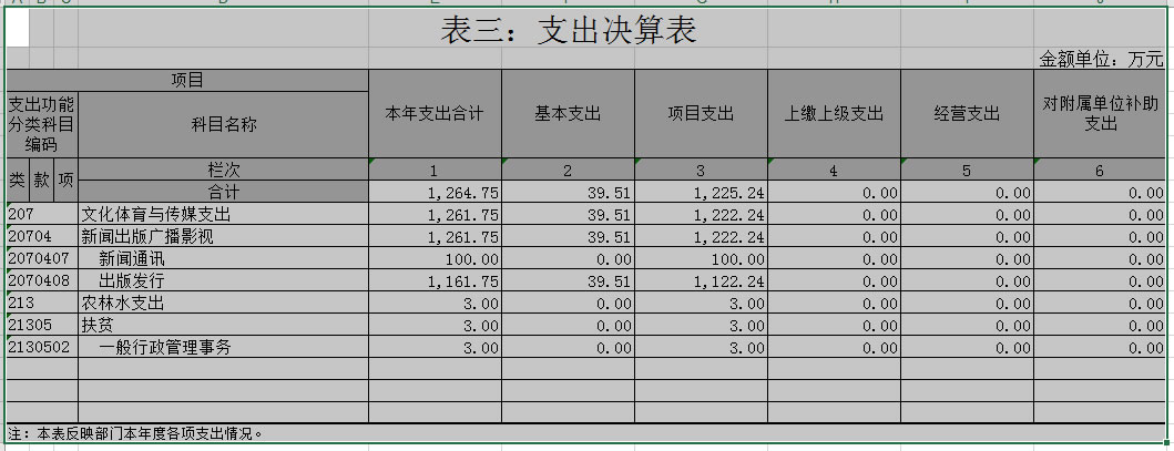目 錄 第一部分:梧州日報社概況 一、主要職能 二、部門決算單位構成 三、編制現狀、人員構成 四、年度主要工作任務 第二部分:梧州日報社2018年度部門決算報表 表一:收入支出決算總表 表二:收入決算表 表三:支出決算表 表四:財政撥款收入支出決算總表 表五:一般公共預算財政撥款支出決算表 表六:一般公共預算財政撥款基本支出決算表 表七:一般公共預算財政撥款安排的“三公”經費支出決算表 表八:政府性基金預算財政撥款收入支出決算表 第三部分:梧州日報社2018年度部門決算情況說明 一、2018 年度收入支出決算總體情況 二、2018 年度一般公共預算支出決算情況 三、2018 年度政府性基金支出決算情況 四、一般公共預算財政撥款基本支出決算情況說明 五、一般公共預算財政撥款安排的“三公”經費支出決算情況說明 六、其他重要事項情況說明 第四部分:專業名詞解釋 第一部分:梧州日報社概況 一 一、主要職能 梧州日報社位于梧州市新興二路125號,創刊于1950年,是梧州市市委機關報,梧州日報社屬正處級差額補助預算管理事業單位。梧州日報社業務范圍是傳播梧州市新聞和其他信息,促進地方社會經濟文化發展。主要經營梧州日報出版、西江都市報出版、相關印刷、相關發行、報紙廣告業務。 二、 二、部門決算單位構成 內設機構:黨委辦公室、總編辦公室、財務室、發行部、廣告部、采編中心、專刊中心、新聞研究室、西江都市報、梧州零距離網站、經濟專刊部、群工部。報社下屬單位:西江月文藝雜志社、梧州日報社印刷廠。 三 三、編制現狀、人員構成 梧州日報社至2018年末實有在職職工169人,其中:報社編制72人,西江月編制3人,印刷廠編制24人,編外聘用70人(未含投遞、臨時廣告人員)。梧州日報社至2018年末實有退休職工71人,其中:報社編制39人,印刷廠編制26人,西江月6人。 四、年度主要工作任務 傳播梧州市新聞和其他信息,促進地方社會經濟文化發展。梧州日報出版、西江都市報出版、相關印刷、相關發行、報紙廣告,《西江月》雜志印刷和發行。 第二部分:梧州日報社2018年度部門決算報表 (決算公開報表作為附件掛在報告尾部,詳見附件) 第三部分:梧州日報社2018年度部門決算情況說明 一、2018年度收入支出決算總體情況 (一)收入總計1264.75萬元,比上年增加85.57萬元,增長7.26%。 1、財政撥款收入1264.75萬元,為市本級財政當年撥付的資金,比上年增加85.57萬元,增長7.26%,主要原因是2018年增加了紙質媒體融合發展專項基金100萬元和第一書記駐村工作經費3萬元,同時,較2017年減少了商務局撥付的購物節活動經費10萬元,財政撥付購買攝影器材5萬元和退休人員工資補助撥款2.43萬元。 (二)支出總計1264.75萬元,比上年增加85.57萬元,增長7.26%。包括: 1、文化體育與傳媒支出1261.75萬元,主要用于單位日常運營支出、人員支出和各項業務支出。比上年增加82.57萬元,增長7%。主要是社會保障支出和住房保障支出增加。 2、農林水支出3萬元,比上年增加3萬元,增長100%。此項包括第一書記駐村工作人員體檢支出、差旅費支出以及其他日常各項業務支出。 二、2018年度一般公共預算支出決算情況 梧州日報社(含西江月文藝雜志社)2018 年度一般公共預算支出1264.75萬元,比上年增加85.57萬元,增長7.26%。主要是社會保障支出和住房保障支出增加。按支出性質看,基本支出39.51萬元,項目支出1225.24萬元。 梧州日報社2018 年度一般公共預算支出年初預算為1147.01 萬元,支出決算為1264.75萬元,完成年初預算的102.65%。 (一)文化體育與傳媒支出年初預算為1147.01萬元,支出決算為1261.75萬元,完成年初預算的100.03%。主要原因是2018年增加了紙質媒體融合發展專項基金100萬元和第一書記駐村工作經費3萬元,同時,較2017年減少了商務局撥付的購物節活動經費10萬元,財政撥付購買攝影器材5萬元和退休人員工資補助撥款2.43萬元。主要用于單位日常運營支出、人員支出和各項業務支出。 1、出版發行1161.75萬元,主要用于工資福利支出505.34萬元、商品和服務支出387.56萬元、對個人和家庭的補助193.85萬元,資本性支出25萬元,債務利息及費用支出50萬元。較2018年年初預算數增加14.75萬元,主要原因是商品和服務支出增加。 2、新聞通訊100萬元,主要用于新聞工作者工資福利支出。較2018年年初預算數增加100萬元,主要原因是增加了紙質媒體融合發展專項基金100萬元,。 (二)農林水支出年初預算為0萬元,支出決算為3萬元,完成年初預算的100%。主要原因收是到第一書記駐村工作經費撥款。主要用于扶貧工作駐村第一書記及工作人員日常事務支出。 1、一般行政管理事務3萬元,主要用于扶貧工作駐村第一書記及工作人員日常事務支出。較2018年年初預算數增加3萬元,主要原因是收到第一書記駐村工作經費撥款。 三、2018年度政府性基金支出決算情況 本部門無政府性基金收入,也沒有政府性基金支出,與去年相比無變化。 四、2018年度一般公共預算財政撥款基本支出決算情況說明 2018年度一般公共預算財政撥款基本支出39.51萬元,比去年減少7.43萬元,下降15.83%,主要是支出分類科目調整。 其中:人員經費37.34萬元,主要包括:基本工資、津貼補貼、績效工資、住房公積金等;公用經費2.17萬元,主要包括:辦公費、印刷費、郵電費、維修(護)費等。 五、一般公共預算財政撥款安排的“三公”經費