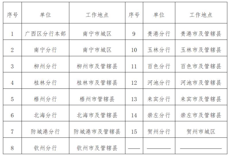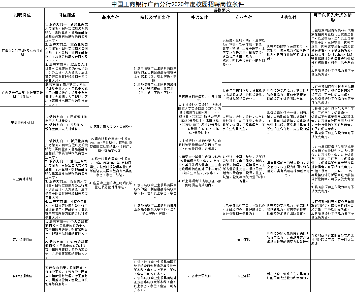 中國工商銀行廣西分行是中國工商銀行轄屬一級分行,資金實力雄厚、服務渠道多元、業務種類齊全、金融科技領先、服務優質快捷、社會信譽優良,是服務廣西經濟社會發展的主力銀行。截至2019年6月末,下轄14個二級分行,438個營業網點,9500名員工,自助銀行900個,各類自助設備4300多臺(其中ATM機2000多臺)。中國工商銀行廣西分行依托工銀集團強大的資金、品牌、渠道和產品優勢,堅持服務實體經濟本源,樹立創新引領理念,加快產品和業務創新,為廣西實體經濟發展提供優質高效金融服務,連續多年獲得廣西壯族自治區人民政府授予的“金融機構支持廣西經濟發展突出貢獻獎”“年度服務八桂綜合貢獻獎”稱號。 根據業務發展需要,中國工商銀行廣西分行誠邀優秀畢業生加盟! 一、招聘機構 中國工商銀行廣西分行 二、招聘崗位 (290人,其中:貧困大學生專項招聘計劃25人) (一)星辰管培生計劃。主要為網點級機構負責人以及各級機構內設部室負責人提供基礎管理人才儲備。新員工錄用后,原則上先安排銀行基礎認知、專業技能鍛造、管理能力提升等三個階段的鍛煉培養,之后根據組織需求和個人履職表現等,聘入相應工作崗位。 (二)專業英才計劃。主要為該行新興業務、重點業務、綜合業務提供專業人才儲備。新員工錄用后,原則上先安排至基層營業網點進行一定期限的培養鍛煉,之后根據個人工作表現及工作需要等,聘入相應工作崗位。 (三)科技菁英計劃。主要為該行科技類業務提供專業人才儲備。目標定位為平臺建設推廣、信息安全與管理、大數據、人工智能、區塊鏈等新技術研發金融科技專業人才。 (四)客戶經理崗位。主要為零售與對公金融營銷崗位引進適用性人才。新員工錄用后原則上先安排至基層營業網點進行一定期限的培養鍛煉,之后根據個人工作表現及工作需要等,聘入相應工作崗位。 (五)客服經理崗位。實行定向招錄,主要在營業網點從事柜面業務處理、廳堂服務、識別推介營銷、智能業務核驗等綜合服務,新員工錄用后須在該崗位工作不少于5年。 三、工作地點 本次招聘以廣西區分行本部以及轄管14家二級分行為單位,工作地點如下表: