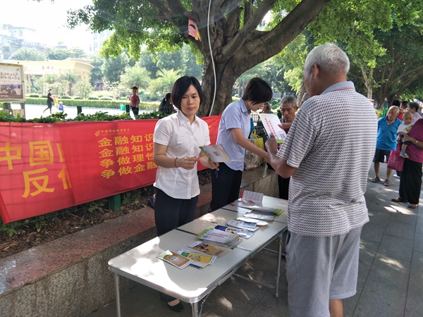 “大爺,了解一下,您平常會遇到讓您投錢進行投資之類的宣傳嗎,真遇到了,一定要先征求家人和朋友的意見,拖延一晚再決定,切莫沖動啊”。 為持續推進金融知識普及,推動金融消費者教育工作,提升社會公眾金融安全意識,郵儲銀行梧州市分行積極響應監管部門的號召,9月在全轄范圍內開展“金融知識普及月 金融知識進萬家 爭做理財投資者 爭做金融好網民”為主題的宣傳活動。