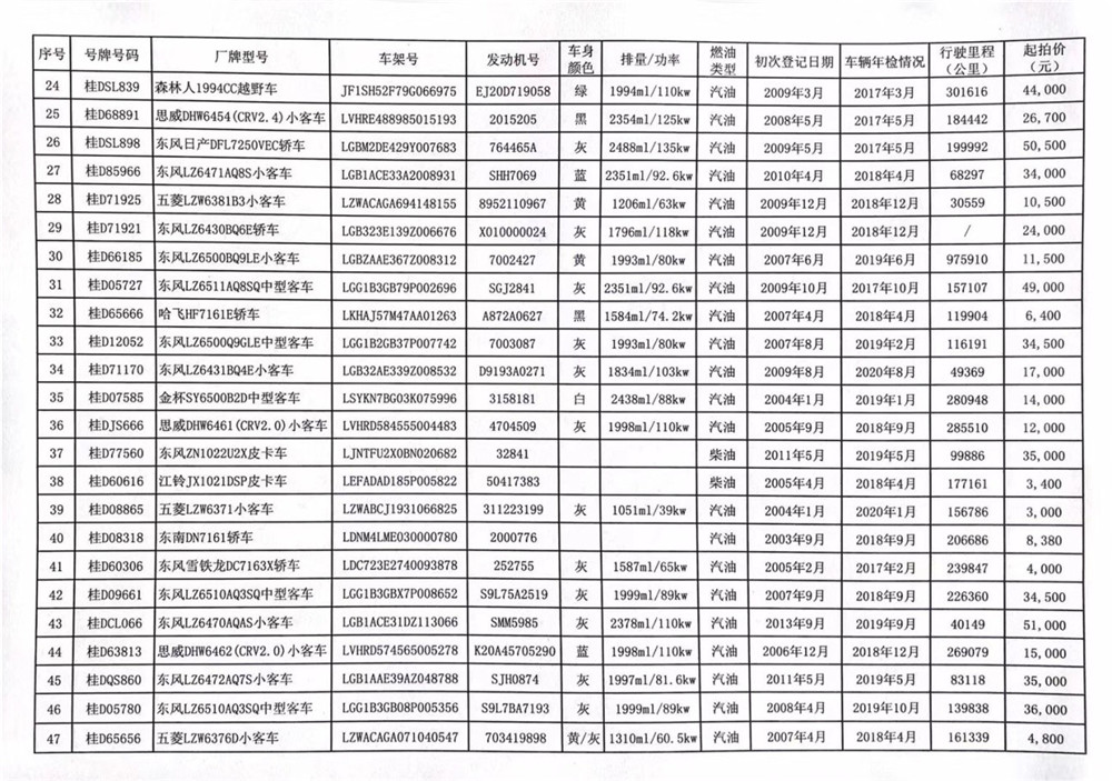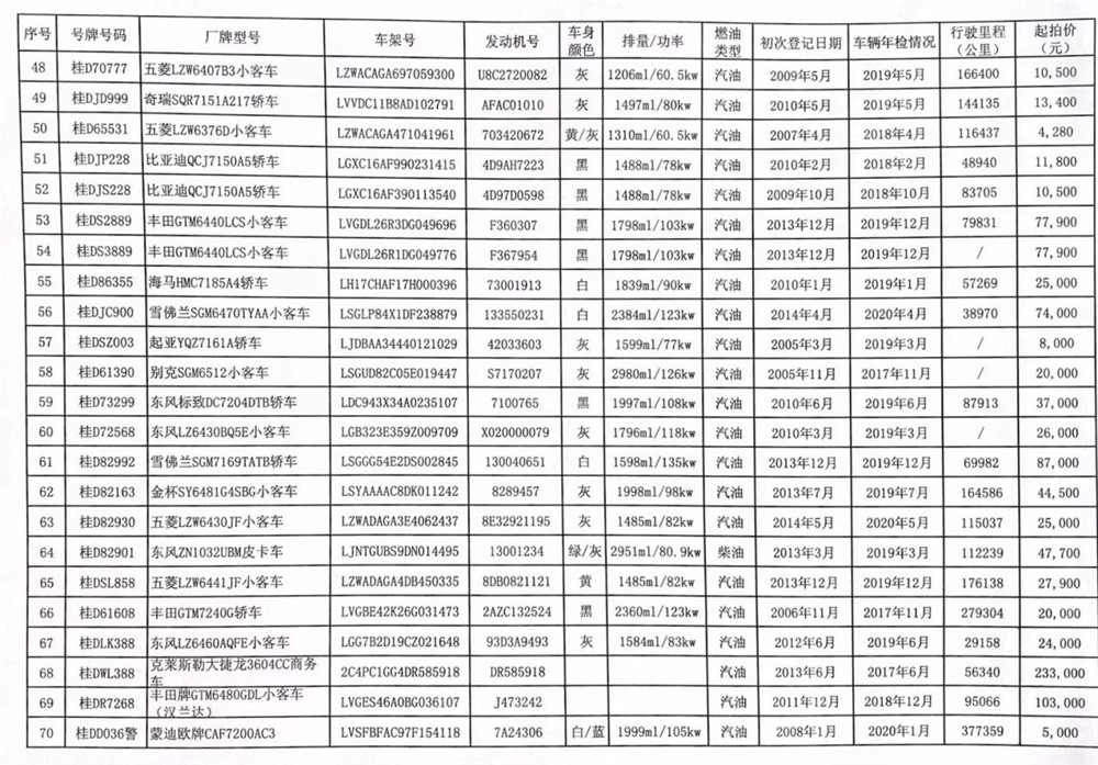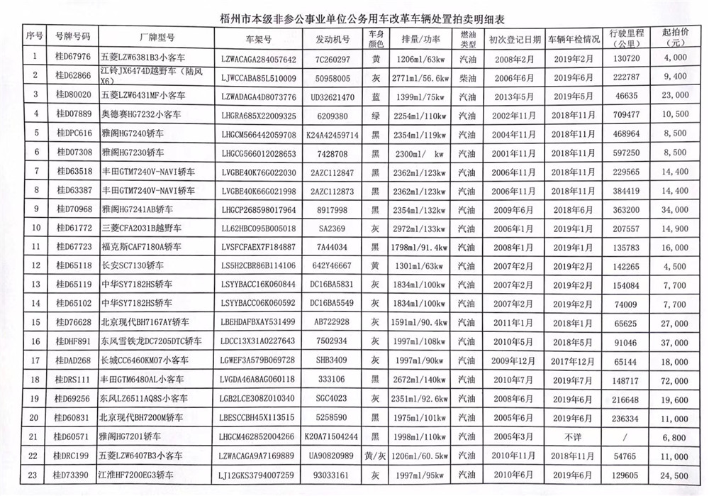 受梧州市財(cái)政局委托,我公司定于2019年12月31日上午9:30,在梧州市中恒體育館按車(chē)輛現(xiàn)狀公開(kāi)拍賣(mài):奧德賽、別克、豐田、漢蘭達(dá)、三菱、雪佛蘭等69臺(tái)車(chē)輛,車(chē)輛展示現(xiàn)場(chǎng)接受咨詢,競(jìng)買(mǎi)保證金5000元/輛,有意競(jìng)買(mǎi)者請(qǐng)于2019年12月30日下午5時(shí)前將競(jìng)買(mǎi)保證金匯入指定賬戶:(戶名:廣西東華拍賣(mài)有限責(zé)任公司,開(kāi)戶行:建行梧州河?xùn)|支行,賬號(hào):45001648652050700227),并持有效身份證原件及復(fù)印件、銀行匯單(以匯款到賬為準(zhǔn))及銀行卡復(fù)印件1份,到本公司辦理競(jìng)買(mǎi)手續(xù),逾期不接受報(bào)名,詳情請(qǐng)與本公司聯(lián)系,詳細(xì)資料備索。 車(chē)輛展示地點(diǎn):梧州市中恒體育館2號(hào)停車(chē)場(chǎng); 車(chē)輛展示時(shí)間:2019年12月20日—2019年12月30日 報(bào)名時(shí)間:2019年12月25日-12月30日17:00時(shí)止 報(bào)名地址:梧州市中恒體育館2號(hào)停車(chē)場(chǎng) 咨詢電話:0774-5830639、13977408181、13907847775 廣西東華拍賣(mài)有限責(zé)任公司 2019年12月20日