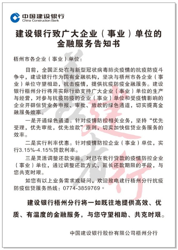 全力為中小企業(yè)提供信貸支持 “真是太快了!沒(méi)想到上班第一天就能貸到100萬(wàn)元!有了這筆資金,我們可以更放心地做采購(gòu)了……”2月3日,春節(jié)假期后上班的第一天,建行梧州分行營(yíng)業(yè)部客戶經(jīng)理在電話回訪梧州市某醫(yī)療科技有限公司時(shí),得知客戶需要資金購(gòu)買(mǎi)口罩、防護(hù)服、體溫計(jì)等抗疫相關(guān)物品,便立即指導(dǎo)客戶申請(qǐng)建行純線上信貸產(chǎn)品“小微快貸”,當(dāng)天便完成了審批和放款,便捷、快速的貸款流程讓客戶贊嘆不已。 疫情防控期間,建行梧州分行與廣大中小企業(yè)守望相助,加大信貸支持,對(duì)信貸業(yè)務(wù)申報(bào)、審批、放款等開(kāi)辟綠色通道,用實(shí)際行動(dòng)支持中小企業(yè)恢復(fù)生產(chǎn)。2月15日,建設(shè)銀行最新推出了面向醫(yī)療等新冠肺炎疫情防控企業(yè)全產(chǎn)業(yè)鏈,以及受疫情影響的小微企業(yè)及企業(yè)主、個(gè)體工商戶等普惠金融客戶群的專(zhuān)屬信貸服務(wù)“云義貸”,剛推出2天,已為3家企業(yè)增加授信204萬(wàn)元!截至2月16日,建行梧州分行已累計(jì)為各中小企業(yè)貸款6筆,金額超過(guò)500萬(wàn)元;為受疫情影響的60多家中小企業(yè)辦理延期還款1400萬(wàn)元。