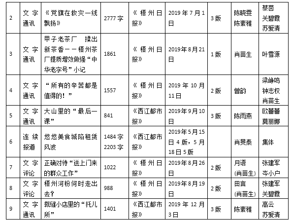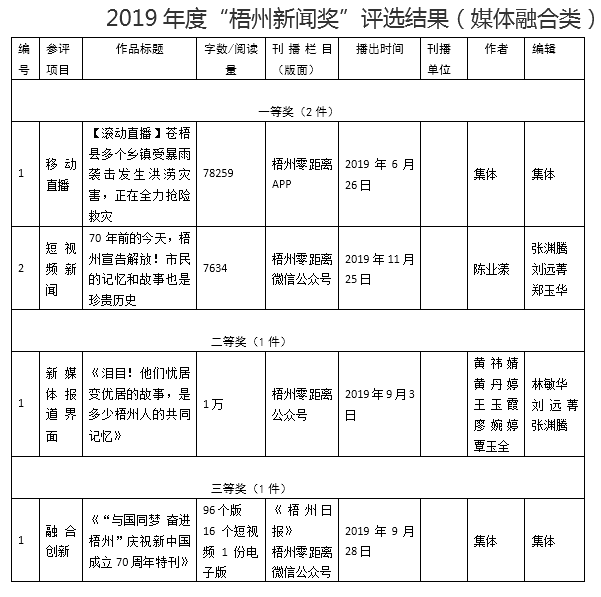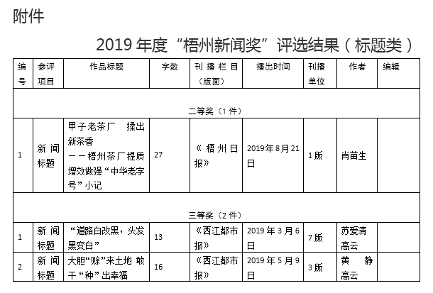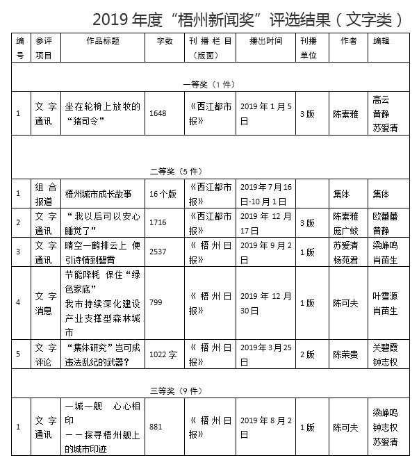 2019年度梧州新聞獎(梧州日報社部分)經(jīng)過評委們的認(rèn)真評選,現(xiàn)評選出30件擬獲獎作品,其中一等獎5件,二等獎8件,三等獎17件。 現(xiàn)予以公示,時間為3月30日至4月3日。在此期間,社會各界均可通過電話、信函、電子郵件等方式對評選結(jié)果發(fā)表意見,進(jìn)行監(jiān)督和評議。 監(jiān)督電話:0774-6021176 電子郵箱:wzxcbxck@126.com 郵寄地址:梧州市長洲區(qū)迎賓路19號,郵編:543002 附件:2019年度“梧州新聞獎”評選結(jié)果 梧州市新聞工作者協(xié)會 梧州市新聞學(xué)會 2020年3月30日