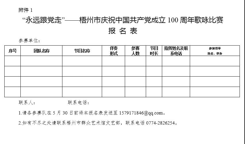 為慶祝中國共產(chǎn)黨成立100周年,深入貫徹落實習(xí)近平新時代中國特色社會主義思想和黨的十九大精神,回顧中國共產(chǎn)黨領(lǐng)導(dǎo)革命、建設(shè)和改革等方面取得的偉大成就,傳承和弘揚紅色火種精神,展現(xiàn)我市黨員干部群眾對黨、對祖國的深厚感情,梧州市于今年4月至6月舉辦“永遠跟黨走”——梧州市慶祝中國共產(chǎn)黨成立100周年歌詠比賽。 即日起至5月30日,全市各機關(guān)單位、各級工會、企業(yè)可以團體形式進行報名參賽啦! 活動具體方案如下: 一、舉辦單位 主辦單位:中共梧州市委員會、梧州市人民政府 承辦單位:中共梧州市委宣傳部、中共梧州市委組織部、市直屬機關(guān)工委、市文化廣電體育和旅游局、市總工會、梧州日報社、梧州市廣播電視臺 執(zhí)行單位:市群眾藝術(shù)館 二、活動時間、地點 時間:2021年4月至6月 地點:縣(市、區(qū))初賽地點由轄區(qū)擬定,中直、區(qū)直、市直單位初賽地點為市文化大廈,決賽在市政廣場升旗臺舉行。 三、活動安排 (一)宣傳發(fā)動階段 4月中旬由主辦單位聯(lián)合向全市各機關(guān)單位、各級工會、企業(yè)發(fā)文,各單位、工會、企業(yè)以團體形式進行報名。 (二)比賽報名階段 1.報名時間:4月至5月 2.參賽要求:以單位團體形式報名參賽,參賽人員要求身體健康,年齡20歲—65歲,能全程參加本次活動。參賽歌曲要求符合主題、積極向上。除鋼琴由主辦方提供外,各參賽隊往返交通、食宿、服裝、伴奏音樂(樂隊或U盤)、道具等自理。 3.參賽形式:初賽由每個參賽隊演唱1首合唱歌曲參賽。進入決賽的參賽隊則演唱2首進行評比(其中1首可與初賽曲目相同)。歌曲可以是新近創(chuàng)作的謳歌黨、歌頌祖國的主旋律歌曲,也可參考合唱歌曲推薦選擇(如需歌譜請聯(lián)系梧州市群眾藝術(shù)館文藝部)。 4.人員要求:每隊參賽人數(shù)為60人以上,人數(shù)多的單位可以組織多個隊參賽,人數(shù)不足的單位可聯(lián)合組隊。有單位領(lǐng)導(dǎo)參演的隊伍可獲加分。 5.報名方式:即日起至5月30日,填寫報名表并發(fā)送至郵箱1579171846@qq.com。報名事宜,可聯(lián)系梧州市群眾藝術(shù)館文藝部,聯(lián)系方式及聯(lián)系方式:謝怡畫,0774-2826254、15807740815;唐遙原,18807741987。 (三)初賽階段 1.中直、區(qū)直、市直單位:由主辦方于6月中旬組織進行初賽,每隊演唱一首歌,演唱完畢由評委現(xiàn)場打分。 2.蒼梧縣、岑溪市、藤縣、蒙山縣、萬秀區(qū)、長洲區(qū)、龍圩區(qū)自行組織初賽,每個縣(市、區(qū))各遴選1支優(yōu)秀隊伍參加決賽。 3.各縣(市、區(qū))請在6月3日前將進入決賽的隊伍報名表發(fā)送至報名郵箱。 所有進入決賽的名單將在市級各大媒體公布。 (四)決賽階段 6月下旬,進行兩場決賽。每隊演唱兩首歌進行評比(其中一首可與初賽曲目相同),演唱完畢由評委現(xiàn)場打分,決出金獎、銀獎、銅獎若干名。 四、評委設(shè)置 為使本次比賽公平公正,將邀請外地評委進行賽事現(xiàn)場評分。 報名表
