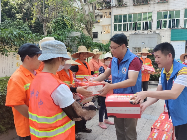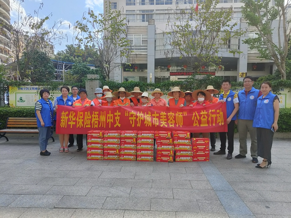 5月14日下午,新華保險梧州中支志愿者一行為梧州市新興二路環衛工人小組、京梧環衛工人小組77名環衛工人送去愛心慰問品,感謝他們為城市清潔作出的貢獻。