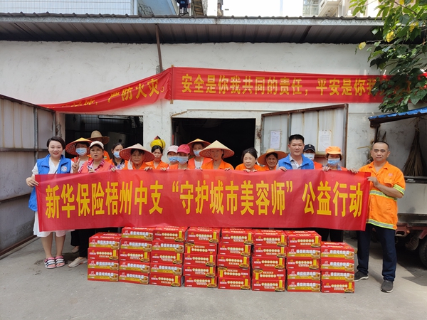 6月10日下午,在端午節(jié)來臨之際,新華保險梧州中支志愿者為梧州市長洲區(qū)大塘路環(huán)衛(wèi)工人小組、西環(huán)路環(huán)衛(wèi)工人小組59名環(huán)衛(wèi)工人送去關(guān)懷及愛心慰問品,感謝他們?yōu)槌鞘星鍧嵶鞒龅呢暙I。