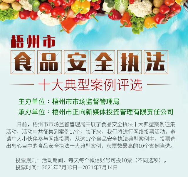 “梧州市食品安全執(zhí)法十大典型案例”投票活動(dòng),將持續(xù)至7月14日(星期三)24時(shí)。投票僅對(duì)微信用戶開放,每個(gè)微信賬號(hào)每天可投10票,每次投票不可重復(fù)投同一案例。投票活動(dòng)結(jié)束后,主辦方將從中確定梧州市食品安全執(zhí)法十大典型案例。