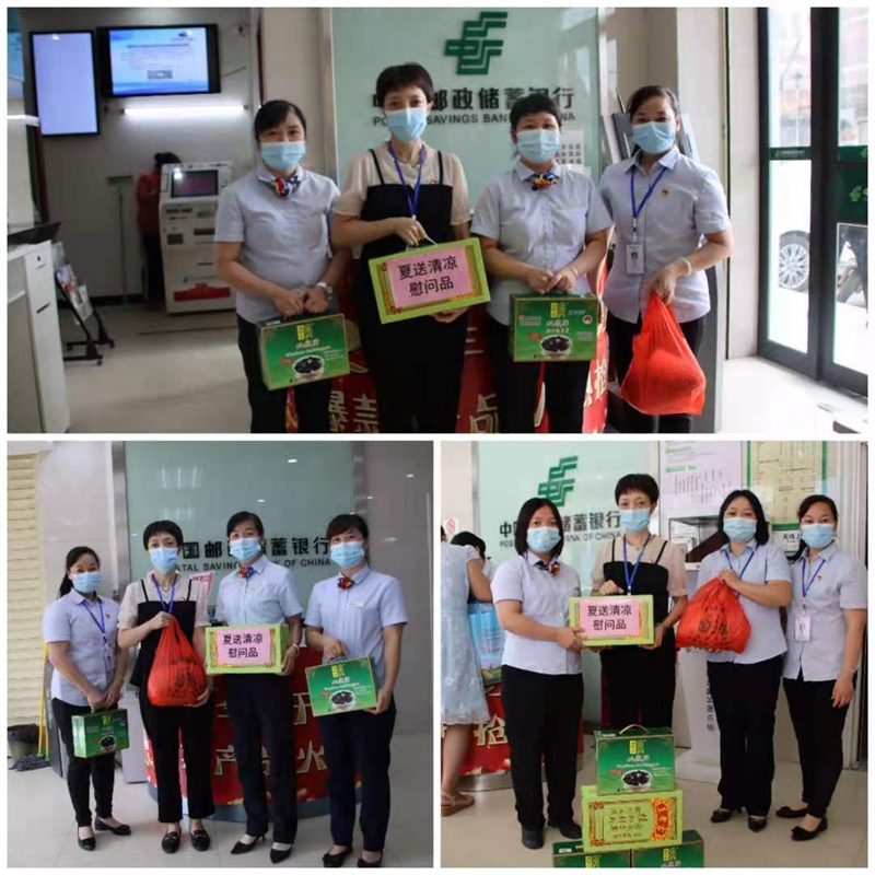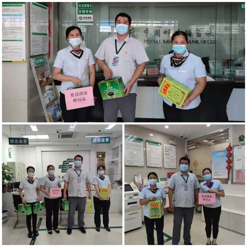 炎炎夏日,酷暑難耐。郵儲(chǔ)銀行梧州市分行時(shí)刻牽掛著在一線工作的員工,于8月初為轄區(qū)各網(wǎng)點(diǎn)送上解暑降溫物資,對(duì)高溫下執(zhí)行嚴(yán)格防疫措施的一線網(wǎng)點(diǎn)員工進(jìn)行慰問。 郵儲(chǔ)銀行梧州市分行工會(huì)主席、副行長(zhǎng)盧天福為轄區(qū)網(wǎng)點(diǎn)一線員工送來王老吉飲料、梧州龜苓膏等解暑降溫物資,感謝他們?yōu)猷]儲(chǔ)銀行梧州市分行的付出,并囑咐他們?cè)趫?jiān)守崗位的同時(shí)要做好自我調(diào)節(jié),克服高溫天氣帶來的影響,以良好的身心狀態(tài)投入到工作當(dāng)中。