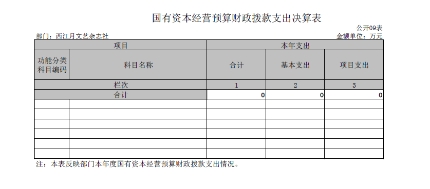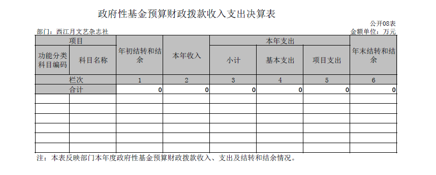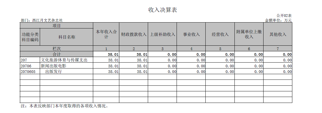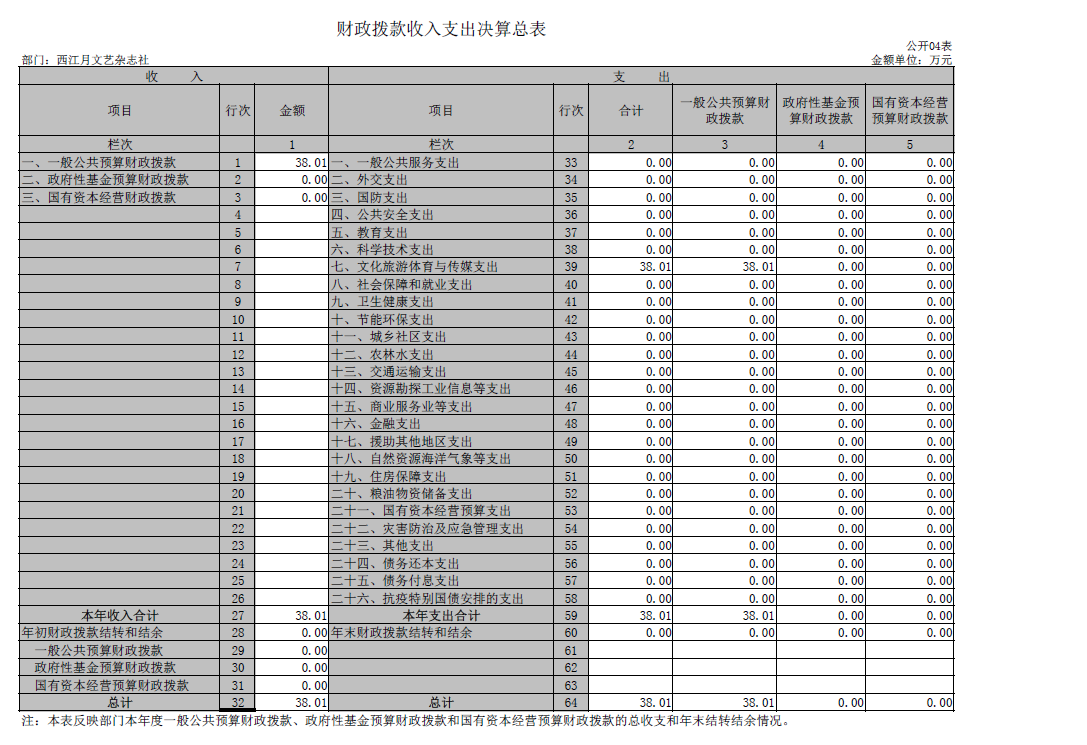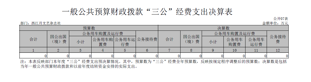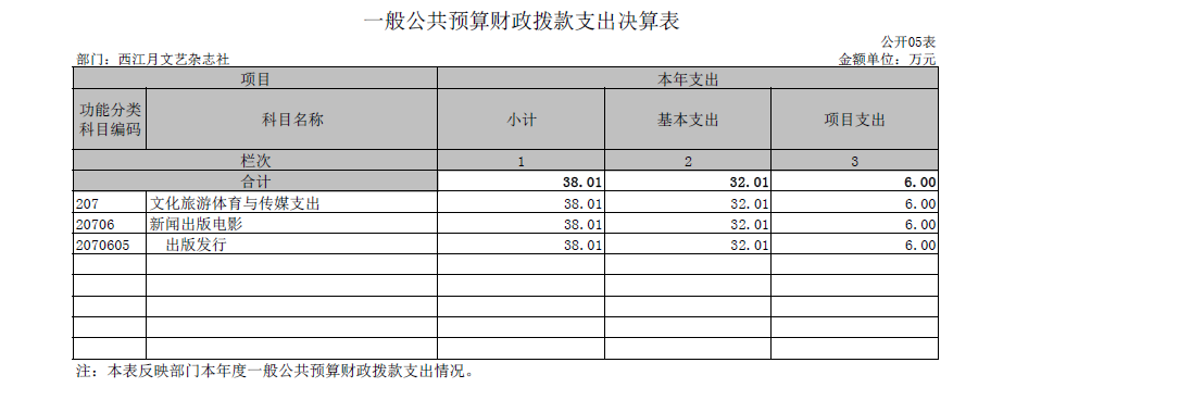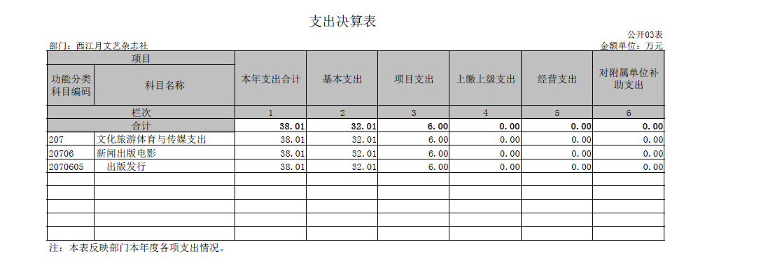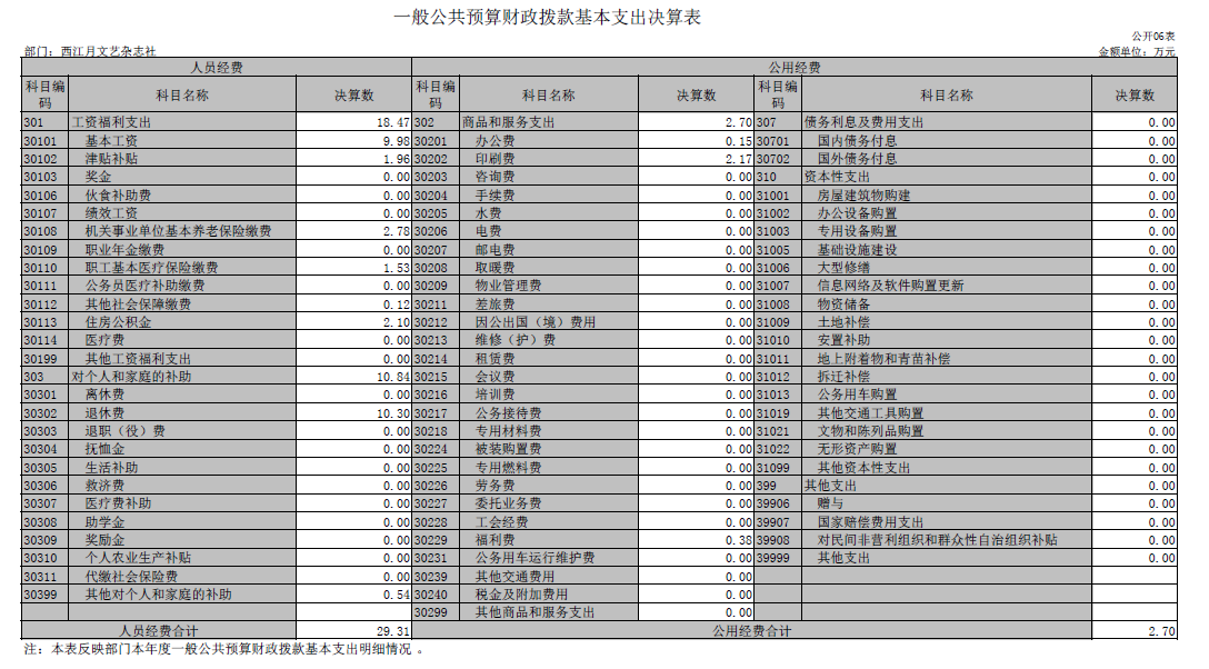 目錄 第一部分:西江月文藝雜志社概況 一、單位職責(zé) 二、機(jī)構(gòu)設(shè)置 三、編制現(xiàn)狀、人員構(gòu)成 第二部分:西江月文藝雜志社2020度單位決算報表 表一:收入支出決算總表 表二:收入決算表 表三:支出決算表 表四:財(cái)政撥款收入支出決算總表 表五:一般公共預(yù)算財(cái)政撥款支出決算表 表六:一般公共預(yù)算財(cái)政撥款基本支出決算表 表七:一般公共預(yù)算財(cái)政撥款安排的“三公”經(jīng)費(fèi)支出決算表 表八:政府性基金預(yù)算財(cái)政撥款收入支出決算表 表九:國有資本經(jīng)營預(yù)算財(cái)政撥款支出決算表 第三部分:西江月文藝雜志社2020年度單位決算情況說明 一、2020年度收入支出決算總體情況 二、2020年度一般公共預(yù)算支出決算情況 三、2020年度一般公共預(yù)算財(cái)政撥款基本支出決算情況說明 四、2020年度政府性基金支出決算情況 五、國有資本經(jīng)營預(yù)算財(cái)政撥款支出情況 六、一般公共預(yù)算財(cái)政撥款安排的“三公”經(jīng)費(fèi)支出決算情況說明。 七、其他重要事項(xiàng)情況說明 第四部分名詞解釋 第一部分:西江月文藝雜志社概況 一、單位職責(zé) 出版文藝雜志,促進(jìn)文藝發(fā)展。《西江月》雜志出版發(fā)行。 二、機(jī)構(gòu)設(shè)置 西江月文藝雜志社屬于差額事業(yè)單位,內(nèi)設(shè)一個職能科室,編輯部。 三、編制現(xiàn)狀、人員構(gòu)成 西江月文藝雜志社人員編制總數(shù)10名,其中:差額編制10名。其中,在職在編人員3人,包括行政在職在編人員2人,后勤人員1人。離退休人員6人。 第二部分:西江月文藝雜志社2020年度單位決算報表 (此部分另附表格,掛報告尾部) 第三部分:西江月文藝雜志社2020年度單位決算情況說明 一、2020年度收入支出決算總體情況 (一)本單位2020年度總收入38.01萬元,其中本年收入38.01萬元,較2019年度決算數(shù)增加6.46萬元,增長20.5%。收入具體情況如下。 1.一般公共預(yù)算財(cái)政撥款收入38.01萬元,為市本級財(cái)政當(dāng)年撥付的資金。較2019年度決算數(shù)增加6.46萬元,增長20.5%,基本支出增加的主要原因人員工資基數(shù)增加,各項(xiàng)人員經(jīng)費(fèi)增加。項(xiàng)目支出增加的主要原因是需印刷《西江月》雜志、印刷費(fèi)等支出增加。 (二)本單位2020年度總支出38.01萬元,其中本年支出38.01萬元,較2019年度決算數(shù)增加6.46萬元,增長20.5%。支出具體情況如下: 1.文化旅游與體育傳媒支出38.01萬元:主要用于基本支出人員的工資福利支出對個人和家庭的補(bǔ)助支出及印刷等日常運(yùn)轉(zhuǎn)支出。 較2019年度決算數(shù)增加6.46萬元,增長20.5%,基本支出增加的主要原因人員工資基數(shù)增加,各項(xiàng)人員經(jīng)費(fèi)增加。項(xiàng)目支出增加的主要原因是需印刷《西江月》雜志、印刷費(fèi)等支出增加。 二、2020年度一般公共預(yù)算財(cái)政撥款支出決算情況 西江月文藝雜志社2020年度一般公共預(yù)算財(cái)政撥款支出38.01萬元,較2019年度決算數(shù)增加6.46萬元,增長20.5%。其中:基本支出32.01萬元,項(xiàng)目支出6萬元。 西江月文藝雜志社2020年度一般公共預(yù)算財(cái)政撥款支出年初預(yù)算為31.77萬元,支出決算為38.01萬元,完成年初預(yù)算的119.6%。 (一)文化旅游與體育傳媒支出年初預(yù)算為31.77元,支出決算為38.01萬元,完成年初預(yù)算的119.6%。主要是人員工資基數(shù)增加,各項(xiàng)人員經(jīng)費(fèi)增加。項(xiàng)目支出增加的主要原因是需印刷《西江月》雜志、印刷費(fèi)等支出增加。 出版發(fā)行38.01萬元,主要用于人員工資支出、《西江月》雜志稿費(fèi)支出及印刷支出等。較年初預(yù)算數(shù)增加6.24萬元,主要是人員工資基數(shù)增加,各項(xiàng)人員經(jīng)費(fèi)增加。項(xiàng)目支出增加的主要原因是需印刷《西江月》雜志、印刷費(fèi)等支出增加。 三、2020年度一般公共預(yù)算財(cái)政撥款基本支出決算情況說明 2020年度一般公共預(yù)算財(cái)政撥款基本支出32.01萬元,比上年增加0.46萬元,增長1.5%,主要是人員工資支出增加。 其中:人員經(jīng)費(fèi)29.31萬元,主要包括:基本工資、津貼補(bǔ)貼、對個人和家庭補(bǔ)助等;公用經(jīng)費(fèi)2.7萬元,主要包括:辦公費(fèi)、印刷費(fèi)等。 支出具體情況如下: 工資福利支出18.47萬元,完成年初預(yù)算的133.8%。主要是人員工資基數(shù)調(diào)增,社會保險費(fèi)用繳納基數(shù)調(diào)增。 商品和服務(wù)支出2.7萬元,完成年初預(yù)算的100%。 對個人和家庭的補(bǔ)助10.84萬元,完成年初預(yù)算的100%。 四、2020年度政府性基金支出決算情況 本單位無政府性基金收入,也沒有政府性基金支出,與去年相比無變化,與預(yù)算相比無變化。 五、國有資本經(jīng)營預(yù)算財(cái)政撥款支出情況說明 本單位無國有資本經(jīng)營預(yù)算財(cái)政撥款收入,也沒有國有資本經(jīng)營預(yù)算財(cái)政撥款支出,與去年相比無變化,與預(yù)算相比無變化。 六、一般公共預(yù)算財(cái)政撥款安排的“三公”經(jīng)費(fèi)支出決算情況說明 2020年度一般公共預(yù)算財(cái)政撥款安排的“三公”經(jīng)費(fèi)支出決算中,因公出國(境)費(fèi)支出決算0萬元;公務(wù)用車購置及運(yùn)行費(fèi)支出決算0萬元;公務