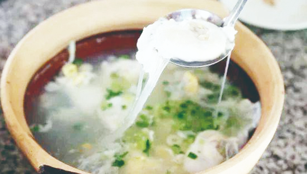 這僅僅是釀春的第一個步驟。將釀好的蛋倒入砂鍋中,不用大火煮,也不蓋鍋蓋,就用小火慢慢煨熟,還要加上用純綠豆粉做的粉絲,晶瑩地墊在鴨蛋下面。最后的工序,則是撒上切碎的枸杞葉。其他地方的人吃枸杞葉只選擇頭部,是春天的妙饌。可是惠州人連梗一起食用,因為枸杞清熱去濕,正適合這里多雨的春天。于是,枸杞葉的綠,蛋黃的金和那點若隱若現的肉餡的紅,在一碗清淡的湯水中,交錯映襯成誘人的美味。