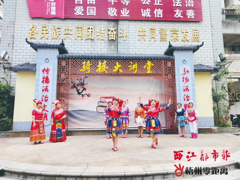 梧州市以鑄牢中華民族共同體意識為主線,深入持久開展全國民族團結進步示范市創建工作,黨和國家民族政策得到有效落實,平等團結互助和諧的社會主義民族關系得到不斷鞏固和發展,為全市經濟社會快速發展營造了民族和睦、社會和諧的良好局面。圖為廣西“壯族三月三”期間,萬秀區南中社區“騎樓大講堂”舞臺,城南街道“騎樓大媽”表演原創山歌,贊美壯美廣西。記者 吳艷虹 攝