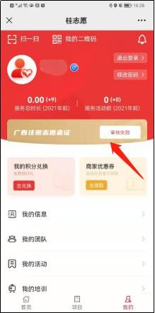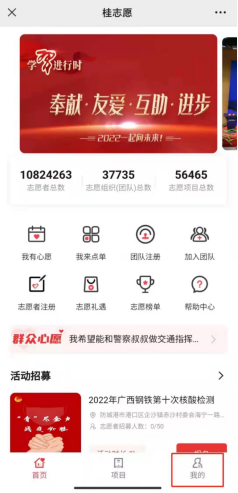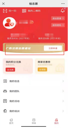 二、登錄成功后再次點擊屏幕下方“我的”→點擊屏幕中部“廣西注冊志愿者證——立即申請”。