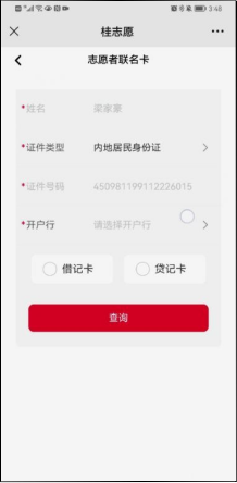 四、查詢制卡進度:再次點擊屏幕下方“我的”→點擊屏 幕中部“廣西注冊志愿者證——申領中”→選擇開戶行、“貸記卡”→點擊查詢。