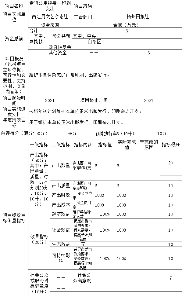項(xiàng)目績(jī)效自評(píng)綜述:根據(jù)年初設(shè)定的績(jī)效目標(biāo),專(zhuān)項(xiàng)公用經(jīng)費(fèi)-印刷支出項(xiàng)目自評(píng)得分為98分。發(fā)現(xiàn)的主要問(wèn)題及原因:無(wú)。下一步改進(jìn)措施:無(wú)。