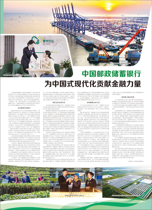 中國郵政儲蓄銀行(簡稱“郵儲銀行”)始終堅決貫徹落實黨中央、國務院決策部署,堅守國有商業銀行的責任使命,以高質量黨建引領高質量發展,推進黨的領導與完善公司治理有機融合,把黨的領導這一政治優勢轉化為公司治理效能。基于自身的資源稟賦優勢,立足服務“三農”、城鄉居民和中小企業的特色定位,郵儲銀行走出一條特色鮮明的大型零售商業銀行發展之路,以特色金融服務全方位助力中國式現代化。 扎實服務鄉村振興 推進中國式現代化,必須全面推進鄉村振興。郵儲銀行堅決把黨中央、國務院關于鄉村振興各項決策部署落實到“三農”金融工作各方面全過程,強化科技賦能、城鄉聯動、內外協同,以“三農”金融數字化轉型為主線,以農村信用體系建設為抓手,以“三農”金融集約化運營為支撐,著力構建“渠道+產品+平臺+運營+風控”全方位“三農”金融數字化發展架構,不斷優化線上線下雙向賦能、有機融合的服務模式,扎實推進服務鄉村振興“十大核心項目”,協同郵政集團圍繞“村社戶企店”深入開展惠農合作項目,打造“三農”金融服務統一品牌,建設服務鄉村振興數字生態銀行,助力建設農業強國、全面推進鄉村振興和實現共同富裕。截至2023年3月末,郵儲銀行涉農貸款余額1.97萬億元;建成信用村38.69萬個,評定信用戶超千萬戶。 在推進鞏固拓展脫貧攻堅成果同鄉村振興有效銜接方面,郵儲銀行嚴格落實“四個不摘”要求,保持主要金融幫扶政策總體穩定,加大對脫貧群體和脫貧地區尤其是國家鄉村振興重點幫扶縣的支持力度。 與此同時,郵儲銀行積極支持農業農村基礎設施建設,圍繞農村基礎設施、農村人居環境改善、農村流通體系建設、公共民生服務等重點領域,創新推出“水務貸”“垃圾處理貸”“光伏貸”等產品,打造全周期金融服務模式。在服務國家糧食安全方面,郵儲銀行把種子、谷物種植等行業列為鼓勵進入類重點行業,把全國優勢農產品區域布局地區和糧食生產大縣作為重點授信區域,著力加大糧食領域信貸投放力度。 為了提升“三農”金融服務質效,郵儲銀行大力推進農村信用體系建設,通過科技賦能傳統線下信用村建設模式,創新推出信用戶貸款,探索農戶普遍授信,為廣大農村客戶精準畫像、主動授信、提供綜合服務。郵儲銀行加強縣支行管理層建設,強化縣域客戶經理等專業隊伍配備,選派優秀干部到鄉村振興一線崗位工作;順應農業農村數字化趨勢,組建數字化轉型聯合團隊,積極培養復合型數字“三農”金融人才。 多措支持實體經濟 為實體經濟服務是金融的天職。郵儲銀行在推動自身高質量發展的同時,把服務實體經濟放在更突出的位置,促進經濟穩定發展。 郵儲銀行積極服務經濟社會發展大局,持續加大對重點領域的支持力度。在支持國家重大基礎設施建設方面,郵儲銀行大力推進基礎設施基金支持項目配套融資,持續加大新基建、新型城鎮化、交通水利、市政基礎設施等重點領域支持力度,為項目建立信用審批綠色通道機制和平行作業機制,全力推動重大項目落地。在支持制造業發展方面,郵儲銀行聚焦重點領域,持續加大對制造業綠色低碳發展、先進制造業、戰略性新興產業、專精特新制造業企業的資金支持,尤其是中長期貸款支持;為制造業企業提供保理等供應鏈金融服務,增強產業鏈供應鏈抗風險能力,助推制造業產業鏈升級和核心技術攻關。 在促進產業鏈供應鏈穩定方面,郵儲銀行圍繞建筑、汽車、工程機械等行業優質企業,量身打造全產業鏈金融服務方案,為產業鏈上下游供應商、經銷商提供金融支持,為小微企業經營周轉提供資金支持;與行業優質企業共同打造供應鏈金融數字生態,依托U鏈供應鏈核心系統,與十余家核心企業平臺實現系統直聯,為疏通產業鏈痛點、堵點保駕護航。 小微企業是經濟發展的生力軍、就業的主渠道、創新的重要源泉。郵儲銀行不斷加大對小微企業的支持力度,強化小微金融敢貸、愿貸、能貸、會貸長效機制,持續加大普惠型小微企業貸款投放力度,推進普惠金融數字化轉型,推動“線上+線下”協同發展,進一步推動小微金融服務增量、擴面。截至2023年3月末,郵儲銀行普惠型小微企業貸款余額1.28萬億元,有貸款余額戶數突破200萬戶。 專精特新及科創企業是中國制造的重要支撐、強鏈補鏈的關鍵所在。郵儲銀行持續提升專精特新及科創企業客群服務能力,打造科創金融服務體系,深化科創金融服務生態圈建設,推出科創企業全生命周期服務方案,持續優化“看未來”評價模型,為客戶提供投商行一體化的金融服務。截至2023年3月末,郵儲銀行服務專精特新及科創企業客戶5.72萬戶。 持續賦能美好生活 讓人民生活幸福是“國之大者”。郵儲銀行充分發揮網絡、資金和專業優勢,全力打造有擔當、有韌性、有溫度的一流大型零售銀行,助力人民生活更幸福更美好。 暖心服務新市民。聚焦新市民支付結算及寄遞等場景需求,郵儲銀行創新推出新市民專屬借記卡“U+卡”,提供多項資費減免優惠,切實降低新市民用卡成本。針對新市民征信信息尚不完善、信貸申請難的問題,郵儲銀行在銀行流水、社保、納稅等基礎上,增加第三方支付流水收入認定客戶還款能力,多維度評估收入能力,幫助新市民做好房貸申請,助力新市民群體實現安居夢。郵儲銀行創新推出新市民專屬小