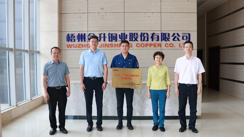 5月23日上午,桂林銀行梧州分行“匯小二”外匯金融服務隊特色服務點在梧州金升銅業股份有限公司正式掛牌。中國人民銀行廣西區分行黨委委員黃育玲、中國人民銀行梧州市分行行長李文明、梧州臨港經濟區管理委員會副主任李堅,桂林銀行梧州分行行長杜忠良等領導出席本次掛牌儀式。