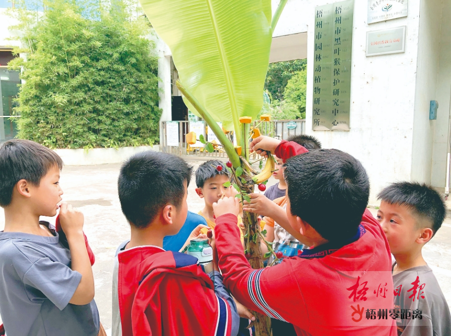 在小記者們最期待的動手實踐環(huán)節(jié),他們把黑葉猴喜愛吃的各種水果插在植物樹干和芭蕉樹上,制作能讓黑葉猴著迷的“豐容盲盒”。制作完成后,科普人員把一個個“豐容盲盒”放進籠舍,學(xué)生們認(rèn)真觀察籠舍里的黑葉猴,只見幼猴在藤蔓間追逐嬉戲,成年猴專注地“破解”覓食機關(guān)。小記者們觀察到它們捧食香蕉、梳理毛發(fā)的生動畫面,紛紛贊嘆:“我仿佛看到了它們在野外的真實生活,我們要好好愛護這些動物。”