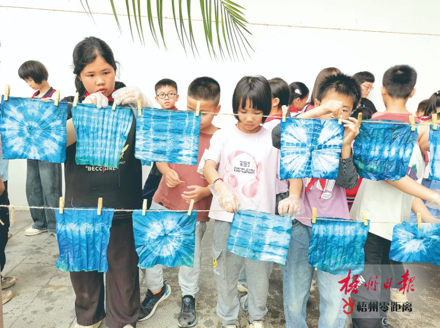 “原來不用畫筆,扎一扎、染一染就能畫出這么美麗的圖案!”小記者們舉起自己的作品爭相展示,藍白相間的布料在陽光下隨風(fēng)輕舞。